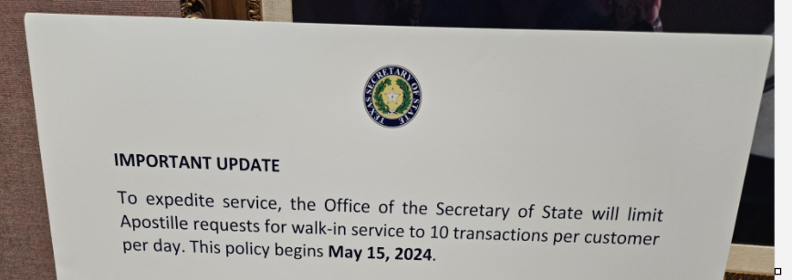 The Texas Secretary of State recently announced another horrible decision/rule that will only hurt the general public and international apostille companies like ours that provide rush Texas apostille services for people, businesses, and corporations.