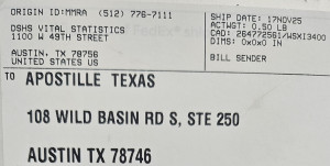 If you are going to have one of the 254 different Texas county offices, mail to us directly a recordable document to apostille on your behalf, like a new certified copy of a Texas birth certificate, death certificate, marriage license or marriage certificate, divorce decree or divorce certificate, divorce verification letter, marriage verification letter, death verification letter, or birth verification letter you MUST make sure they put our company name (Apostille Texas) on the to: address.
